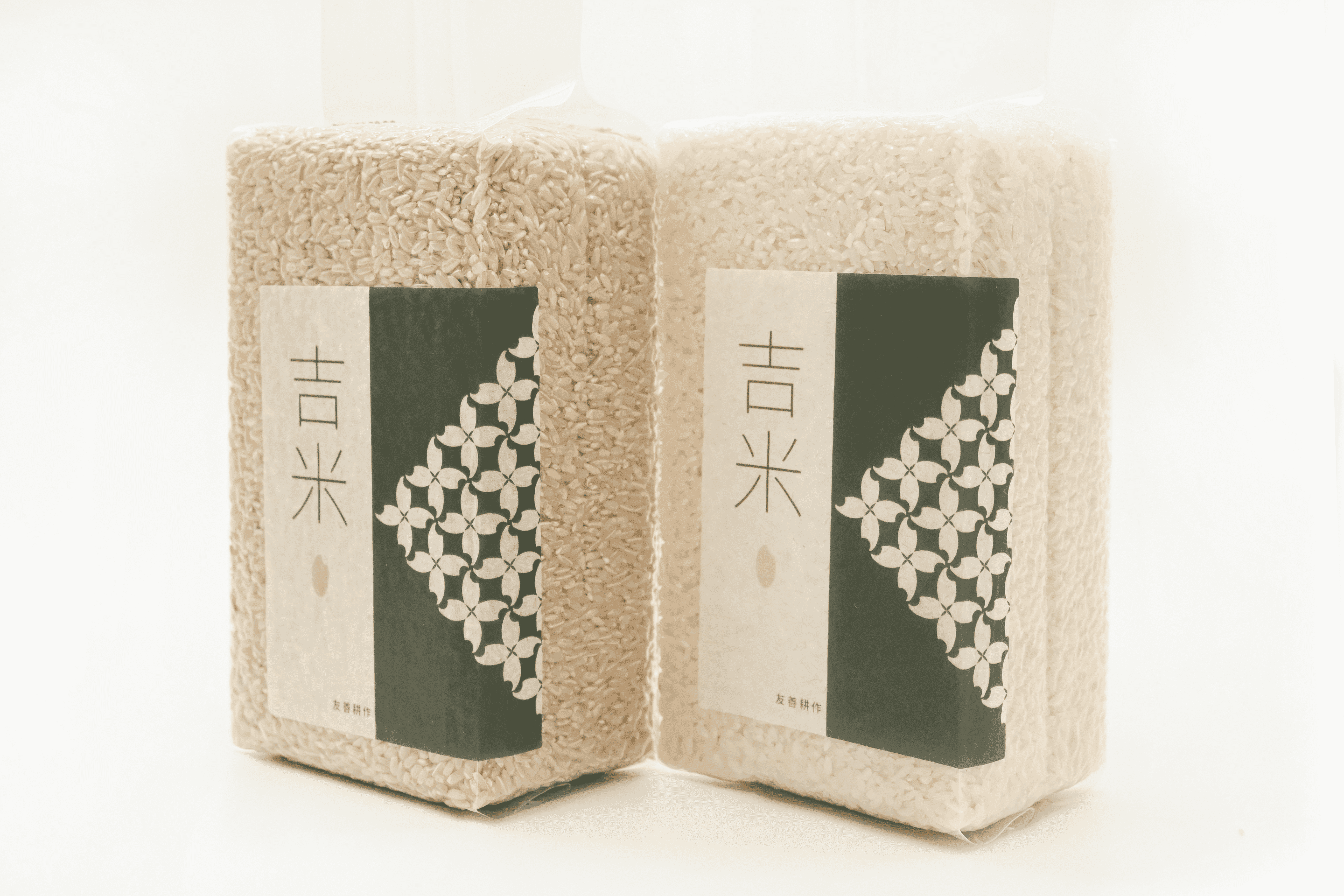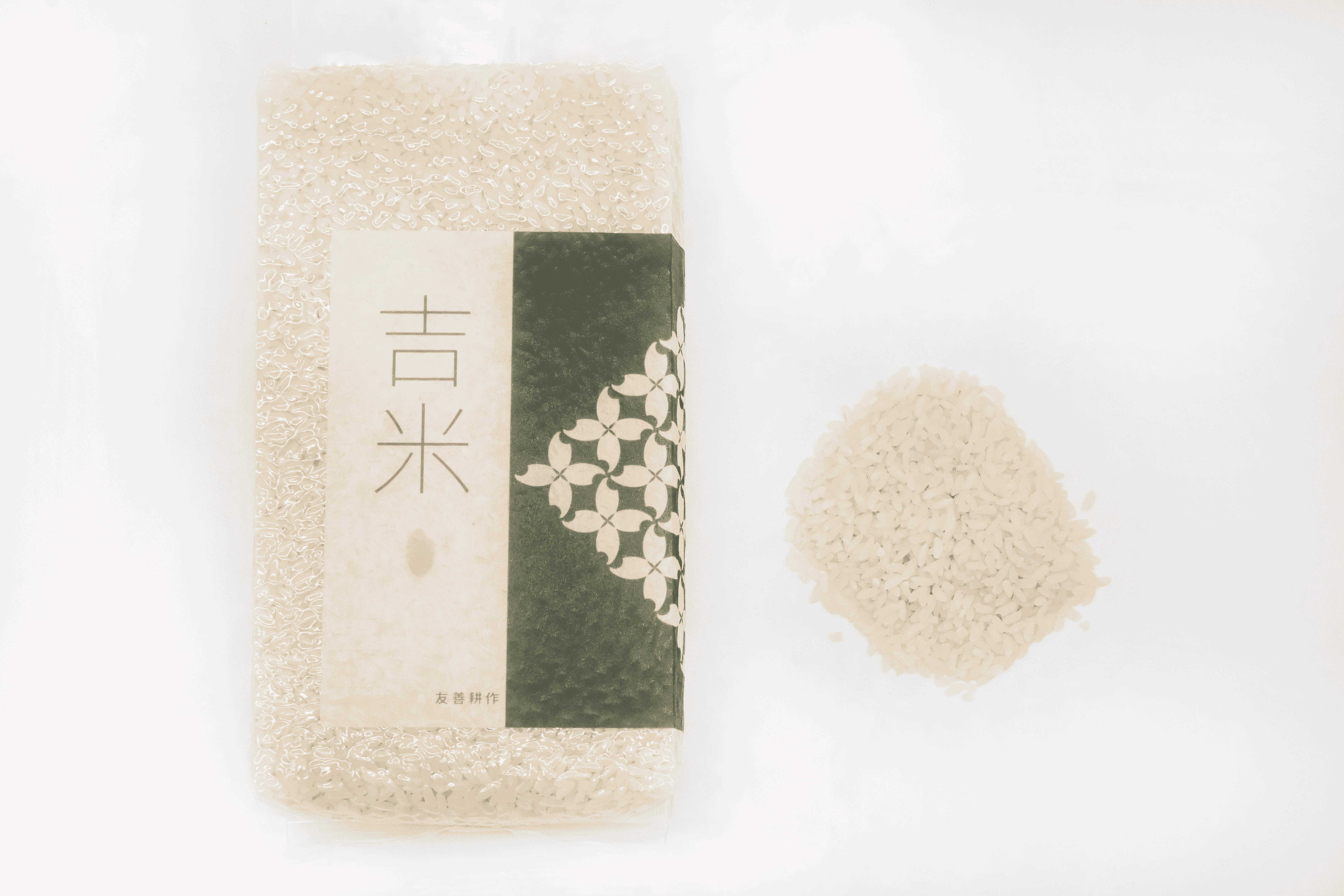 The packaging design features a continuous pattern formed by rice grain silhouettes, symbolizing abundance and natural harmony. The green background reflects the brand’s commitment to sustainability and environmental responsibility.